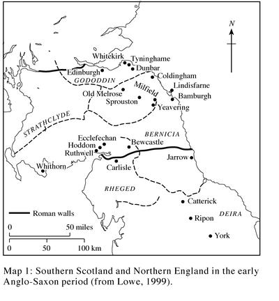 The disruption of Bernicia by the incursions of Scots from the north and Danes from the south is illustrated by the fact that few of the large enclosed Anglian sites, such as Hoddom (near the site of the Ruthwell Cross) or St Abb’s Head (Berwickshire) developed into the commercial towns of the medieval period: only Whithorn and Dunbar in southern Scotland “made the vital step from villa regia or monastery to medieval urban centre” (Lowe, 1999: 55).