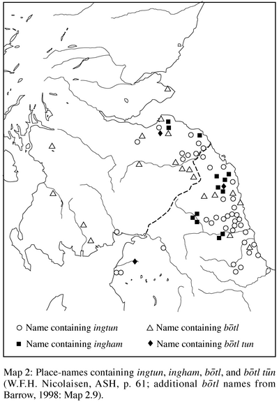 Nicolaisen (1976; also in McNeill and MacQueen (eds.), 1996 – hereafter ASH) has shown how the spread of settlements can be mapped by the distribution of selected name types (Maps 2 and 3: cf. the bōtl and wīc types with the earlier hām, ingahām and ingtūn types). Amongst the earliest are those with ingahām, as in Lyneryngham ‘the settlement of the people by the Linn’ (now East Linton) (Lowe, 1999: 33). This name is one of a number showing the interaction of Anglian and Cumbric: linn is a Cumbric word meaning ‘pool’. A mixed Anglian-Cumbric culture at the leading edge of Anglian settlement is also indicated by some of the archaeological evidence. As Proudfoot and Aliaga-Kelly point out, “Anglian Northumbrian settlement may have developed through relationships with the British landowners or farmers, independent of fluctuations in power in Northumbria and its neighbours” (1995: 23). Apart from some areas such as East Lothian that were already relatively treeless in the late Roman period (Patterson, 1999), the land had not reached its carrying capacity, even within the technological limits of the period. At this time there were still internal frontiers of cultivation, and land could be obtained without necessarily displacing the resident population. Nevertheless, as we shall see (§4.2.2.1), there seems to be little influence of p-Celtic on Older Scots.