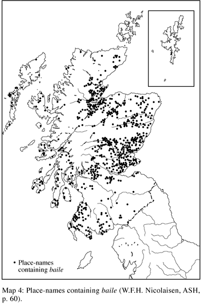 What is now Scotland south of the Forth-Clyde isthmus remained part of Northumbria for about three hundred years until, with Northumbria weakened by the attacks of the Vikings (see below), it was ceded to the Scots. Exactly when the Scots acquired Lothian (in the broad sense of Scottish Northumbria from the Forth to the Tweed) is unclear – dates ranging from 973 (Lothian ceded by Edgar) to 1018 (Scottish victory at Carham) are given in different sources. However, Barrow considers that the supposed cession of Lothian simply accepted a fait accompli and that this territory had fallen under Scottish control already. Long before 973 “the Scots were exerting pressure upon, and indeed almost certainly appropriating for settlement, the territory north of Lammermuir” (1962: 12),[12] hence the large number of Gaelic place-names in Lothian. Nicolaisen contrasts baile ‘hamlet’ and achadh ‘field’ names – the absence of the latter in the south-east of Scotland suggests that the small numbers of Gaelic speakers in the east were “landowners rather than tillers of the soil” (1976: 128) (see Maps 4 and 5).[13]