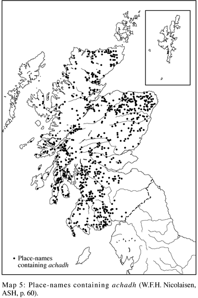 [13] Taylor has re-examined the place-names of Fife, and concludes that there are no achadh names there. He identifies the generic of names like Auchtermuchty as uachdar ‘upland’ (2000: 209).