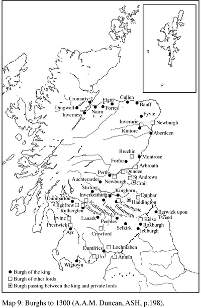 The burghs, as foci of internal and external trade, were crucial in the spread of Lowland Scots, although the population even of the largest would have numbered hundreds rather than thousands (Barrow, 1981: 94). There was a great deal of internal migration as new burghs were created, and this would have increased the homogeneity of the dialect that spread as a result. The population of the early burghs would have included Lothian Angles, and a handful of Gaelic speakers, and in the west and south-west Cumbrians (conceivably still Cumbric speakers). “For the most part, however, they seem to have come into Scotland from Flanders, the Rhineland, northern France, and England especially eastern England” (Barrow, 1981: 92).